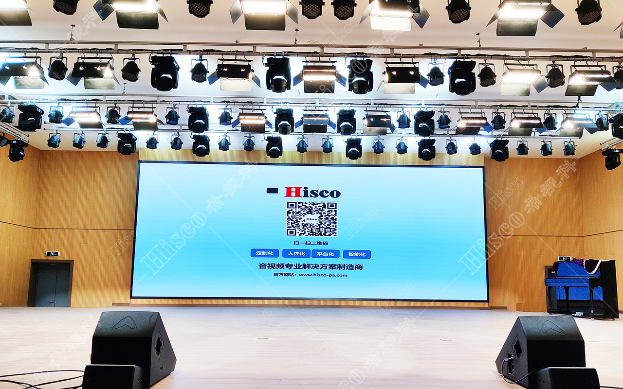 本校报告厅是一个中大型报告厅,主要为举办学校学术会议、演讲、公共大课培训及各种文艺演出,根据其建筑结构特点和使用功能及国家相关标准,根据面积和观看距离选择合适的LED大屏,展现整个舞台的宏伟大气;扩声采用集中与扩散相结合的扩声方式,开会和报告时采用单声道集中扩声还原模式,所有音源都从主席台发出,声像的平衡、方位无倾斜。保证了下面学生听到的直达声响度和均匀度达到要求,让学生听的适宜和舒服。演出时采用左右立体声空间成像模式,直达声与辅助音箱的效果声相结合表演,传达表演意境,使得演员和观众之间产生一种无声的交流。
